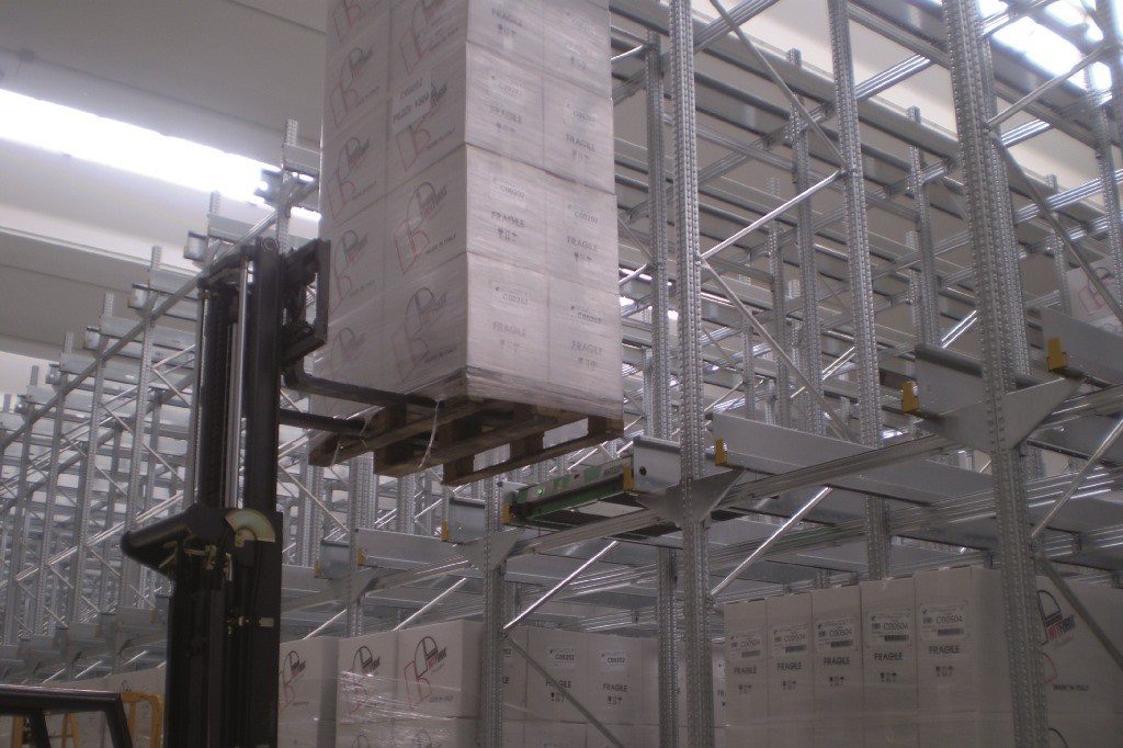 Storage method utilized in the food and pharmaceutical industries where precise management of expiry dates is required. It favours the picking of pallets containing goods produced earlier, hence stored as first. AUTOSAT® operates in this function allowing storage from the front and picking from the opposite end of the racking system. It is therefore necessary that the two faces of the racks are accessible to allow storage and picking.
