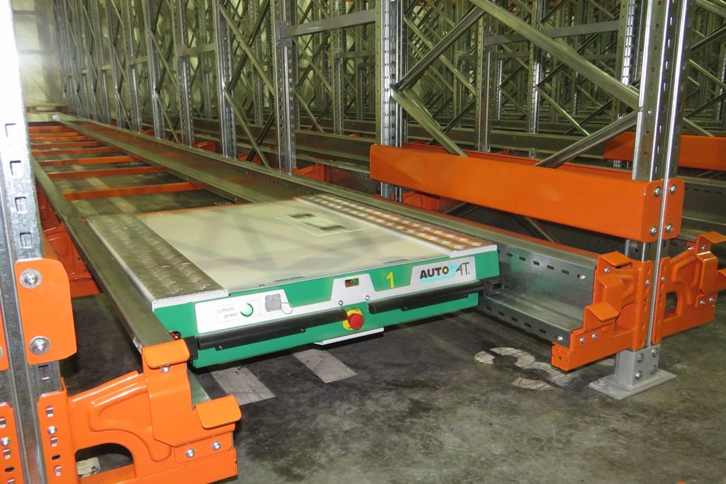 AUTOSAT® is an automatic shuttle able to move within the drive-in channels, offering high density automated storage. Controlled by an interactive radio transmitter, AUTOSAT® is able to load, unload and arrange pallets into the drive-in channels. Moved by the traditional fork lift or automatically using AUTOSATMOVER ™, AUTOSAT® operates in every channel according to the FIFO (First in First out) and LIFO (Last in First out) procedures. One of the best uses for AUTOSAT® is in refrigerated warehouses where temperatures can reach down to -30°. In such an environment, storage systems have to maximise the number of pallets and minimize the number of aisles to optimize the cost/benefit ratio.