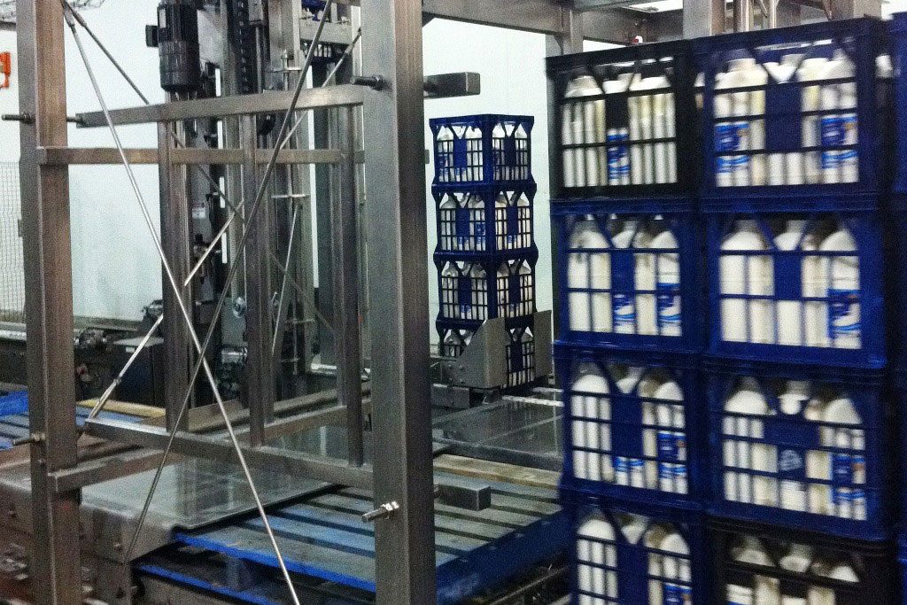 Designed to automatically load-level and palletize stacks of full milk crates at speeds of up to 65 pallets per hour.