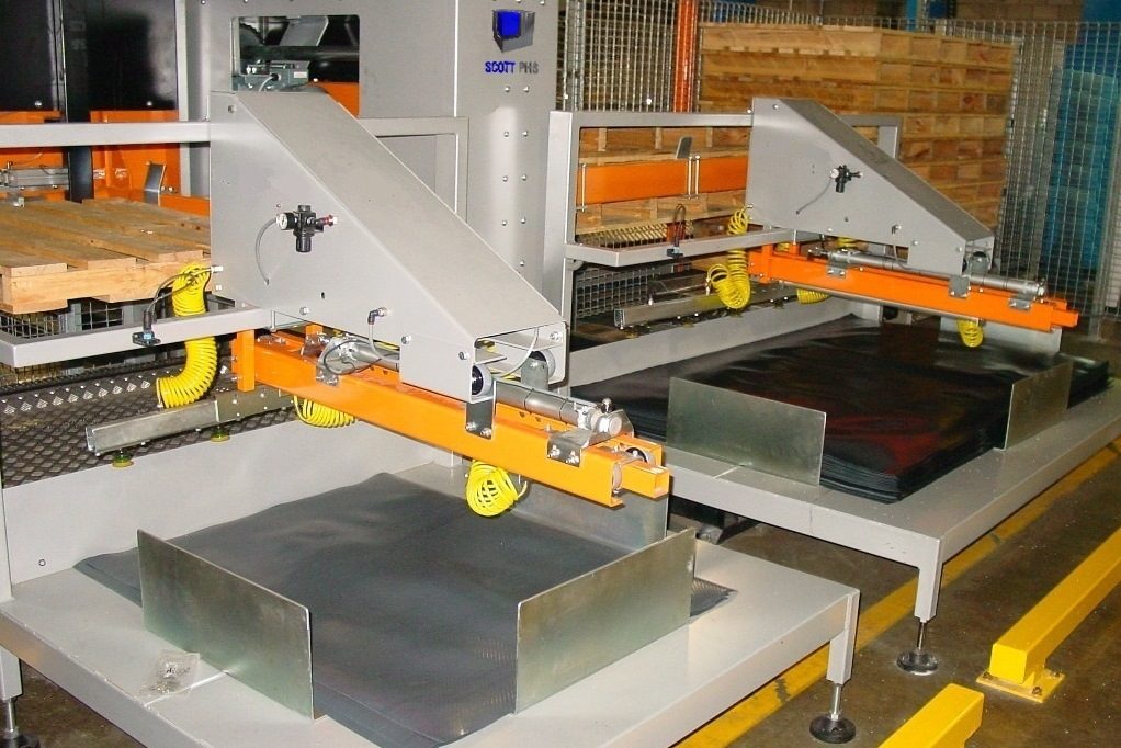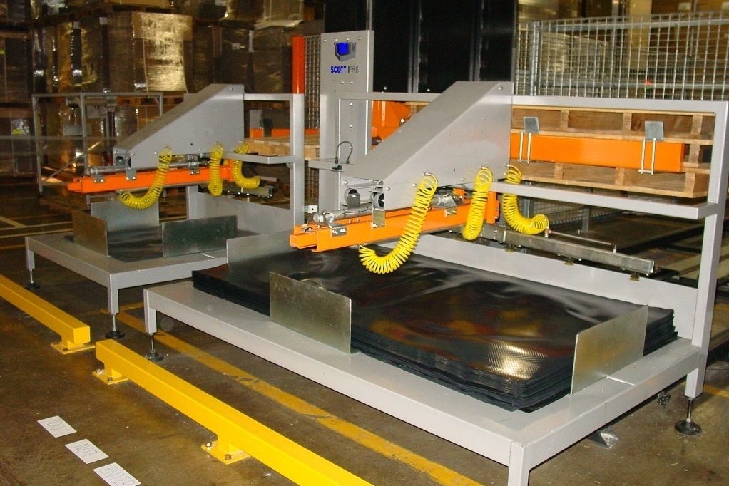 Used to automatically place slip sheets or layer sheets onto pallets as part of an automatic palletizing system.